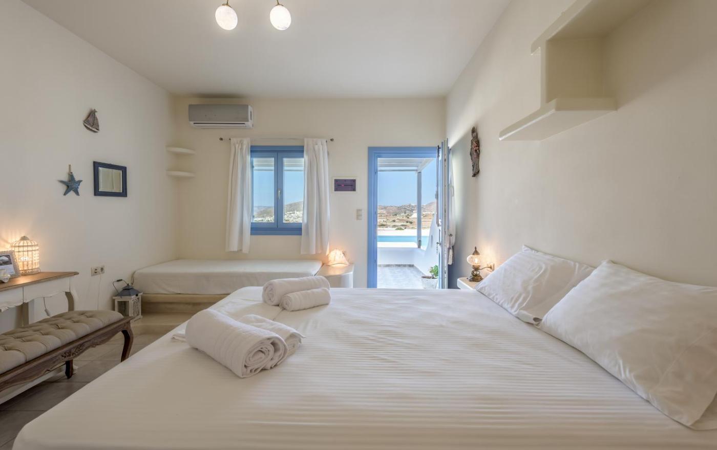Deluxe Triple Room with Sea View. Guests will have a special experience as the triple room offers a pool with a view. Guests can make meals in the kitchenette that is equipped with a stovetop, a refrigerator, kitchenware and a tea and coffee maker. The triple room provides air conditioning, a private entrance, a balcony with sea views as well as a private bathroom featuring a walk-in shower. The unit offers 1 bed. ;