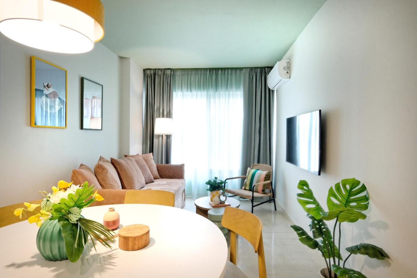 One-Bedroom Apartment with Balcony and City View. Featuring a private entrance, this air-conditioned apartment comprises 1 living room, 1 separate bedroom and 1 bathroom with a bath and a shower. Guests can make meals in the kitchen that comes with a stovetop, a refrigerator, kitchenware and a microwave. Boasting a terrace with city views, this apartment also provides a washing machine and a flat-screen TV with streaming services. The unit offers 2 beds. ;